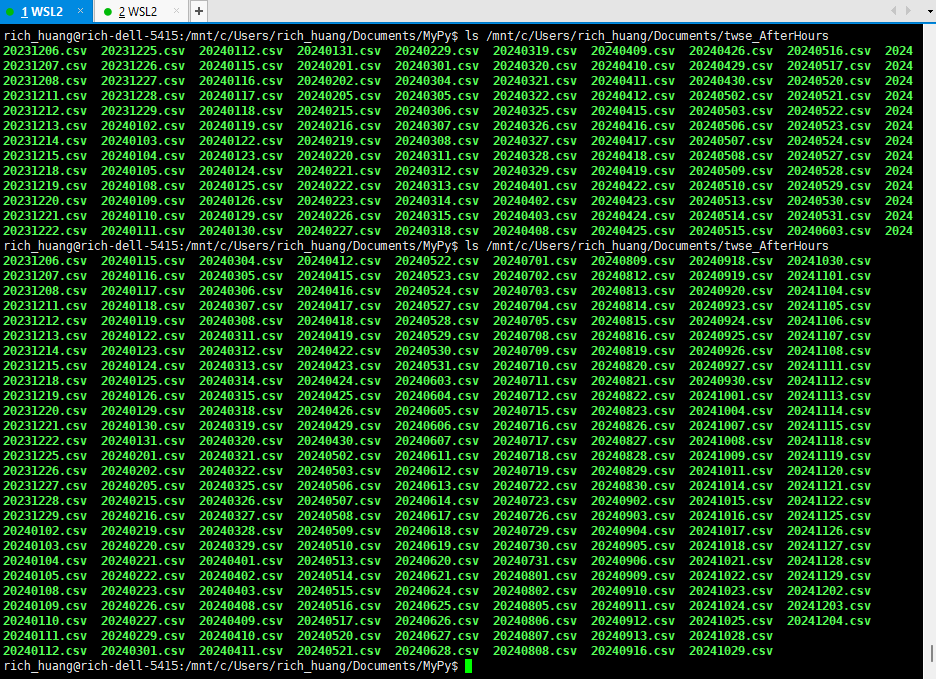| rich_huang@rich-dell-5415:/mnt/c/Users/rich_huang/Documents/MyPy$ find /mnt/c/Users/rich_huang/Documents/twse_AfterHours -type f | wc -l